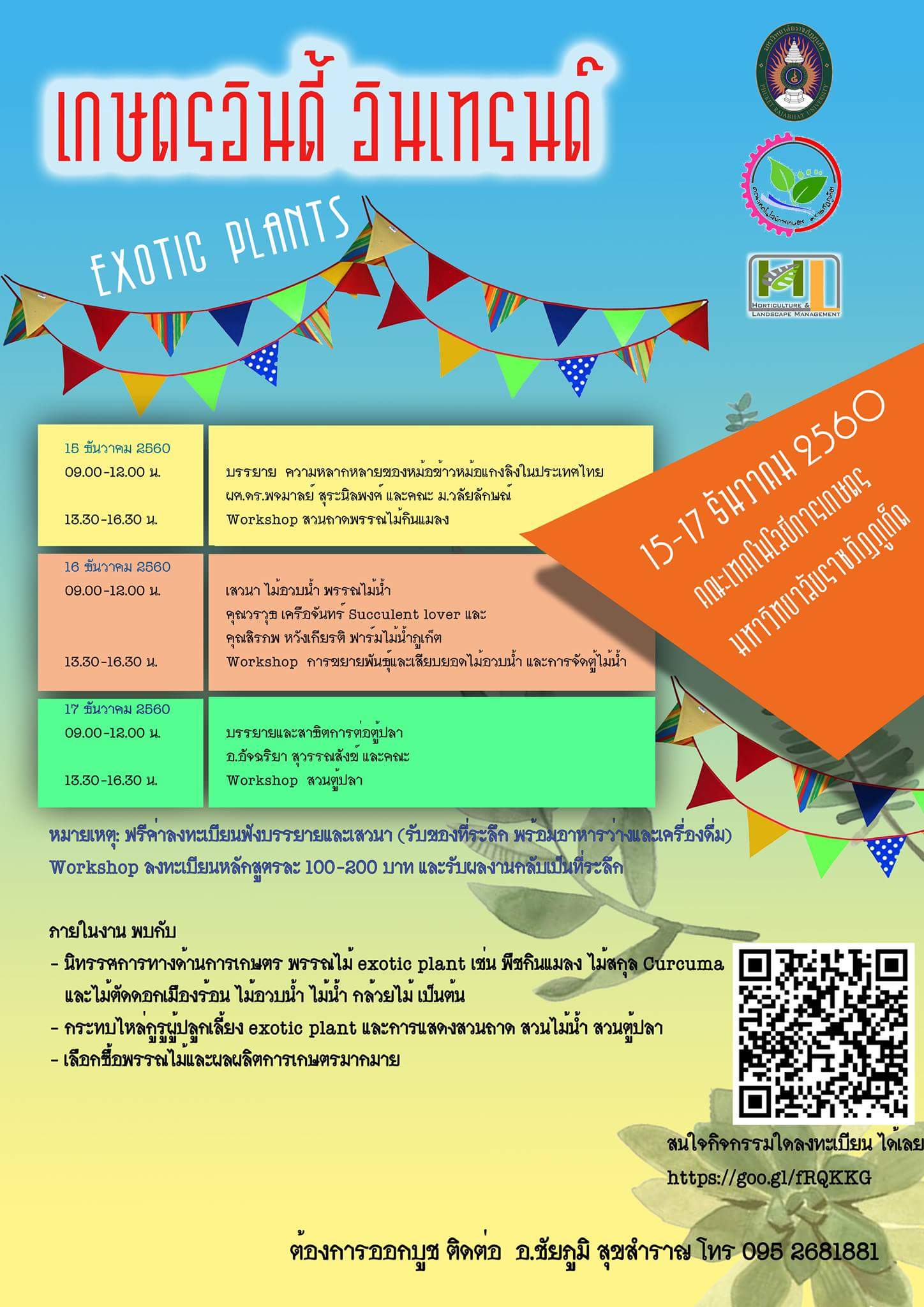 สาขาวิชาการจัดการพืชสวนและภูมิทัศน์ คณะเทคโนโลยีการเกษตร มหาวิทยาลัยราชภัฏภูเก็ต เชิญร่วมงาน "เกษตรเพื่องานอดิเรก Exotic plant อินดี้ อินเทรนด์" ระหว่างวันที่ 15-17 ธันวาคม 2560 ณ คณะเทคโนโลยีการเกษตร มหาวิทยาลัยราชภัฏภูเก็ต
